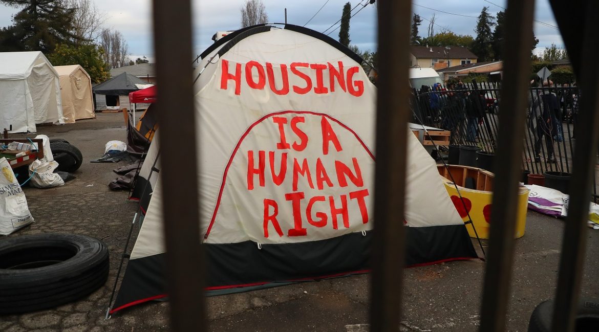 Görsel: California, Oakland’daki evsizlerin kurduğu kampta, üzerinde “Barınma hakkı bir insan hakkıdır.” yazan bir çadır. (Digital First Media/East Bay Times, Getty Images)