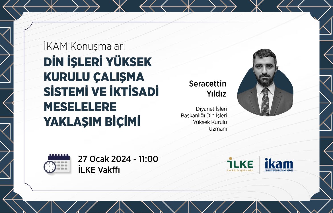 İLKE Vakfı İslam İktisadı Araştırma Merkezi’nin düzenleyeceği etkinlikte, Diyanet İşleri Başkanlığı Din İşleri Yüksek Kurulu Uzmanı Seracettin Yıldız, “Din İşleri Yüksek Kurulu Çalışma Sistemi ve İktisadi Meselelere Yaklaşım Biçimi” konusuyla kurulun çalışma sistemini, ekonomiyle olan ilişkisini ve iktisadi meselelere yaklaşımını ele alacak. Aynı zamanda, dinî kaynaklara dayalı olarak iktisadi meselelere bir perspektif sunacak ve kurulun bu alandaki rehberlik ilkelerini özetleyecek. Bu panel, Din İşleri Yüksek Kurulu’nun iktisadi meselelere yaklaşımını anlamak, kurumun çalışma sistemi hakkında bilgi edinmek ve İslam’ın ekonomik prensipleriyle uyumunu anlamak için bir fırsat olacak.