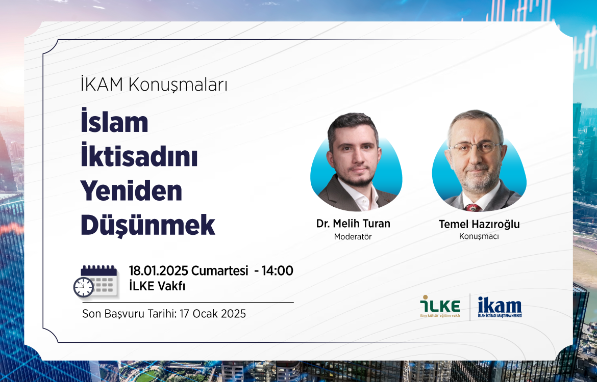 İKAM Konuşmaları kapsamında düzenlenecek bu etkinlikte, Temel Hazıroğlu’nun konuşmacı ve Dr. Melih Turan’ın moderatör olarak katılacağı bir oturumda “İslam İktisadını Yeniden Düşünmek” başlıklı konu ele alınacak. Etkinlikte, İslam iktisadının tarihsel kökenleri, güncel ekonomik sistemlerle ilişkisi ve geleceğe yönelik uygulanabilirliği üzerinde durulacak. Aynı zamanda, İslam iktisadının temel prensiplerinin modern ekonomiyle nasıl örtüştüğü ve farklılaştığı kapsamlı bir şekilde tartışılacak.